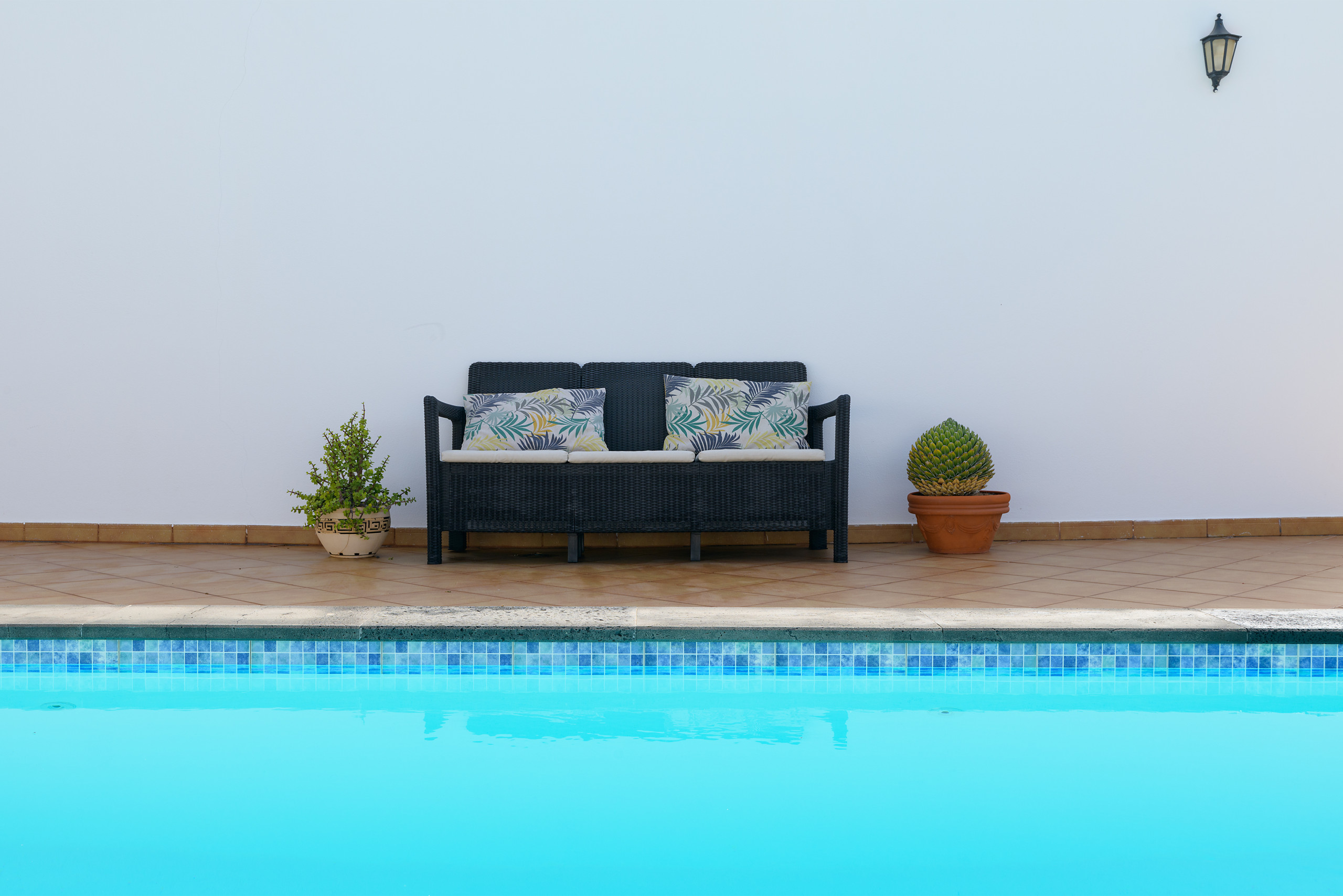 Dispone de un pequeño jardín y una piscina grande, que se accede desde la terraza que tiene bonitas vistas, mesa y sillas y un sofá. En la zona de la piscina hay barbacoa y mobiliario para poder comer o cenar, bajo una sombrilla. La piscina puede ser climatizada en invierno por un coste adicional de 120€ a la semana.
